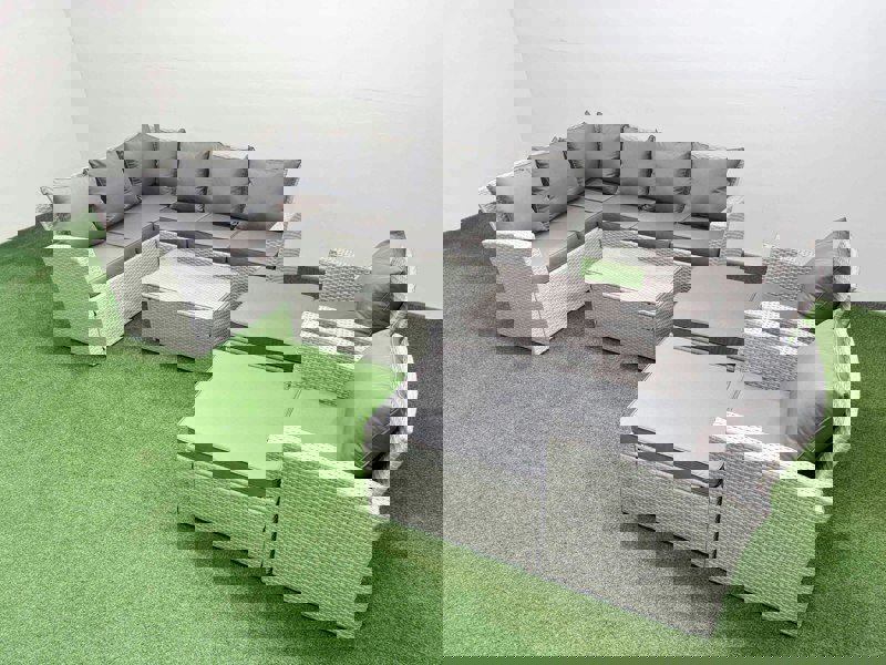 Finished in light grey mixed rattan with dark grey fabric, the set is supplied flat packed for easy assembly. Comfort is enhanced with an ergonomic high back and a reclining design, alongside supportive seat and back cushions.