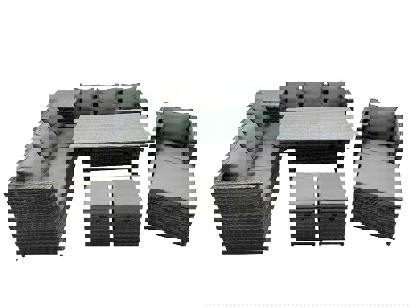 Create a refined outdoor setting with this modern deluxe rattan furniture set, designed to suit a range of occasions across the garden, patio or conservatory. With cushions included and shaped to fit the sofa and chairs, it offers a comfortable place to relax and dine.
