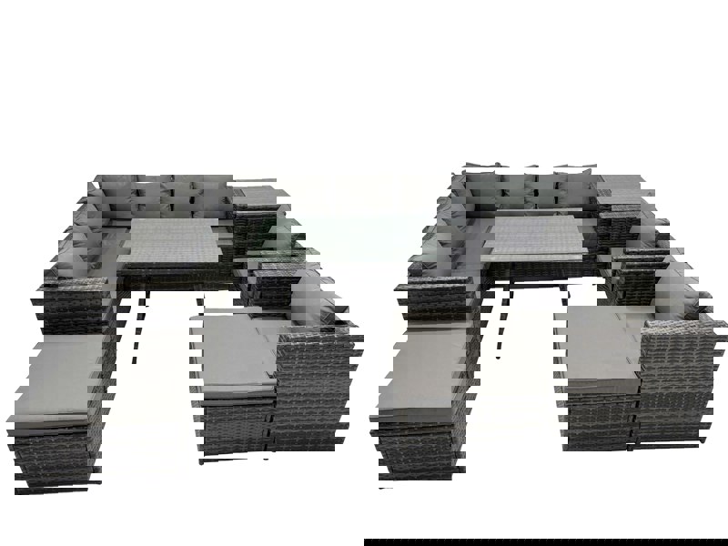 Delivered flat packed for easy assembly, the set includes a dining table, side coffee table, sofas, chairs and footstools for flexible entertaining and everyday lounging. For added comfort, it comes with seat cushions and soft pillow back cushions, while the tempered glass top is secured with suckers to help prevent sliding.