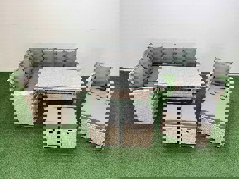 Create an inviting outdoor seating and dining area with this deluxe high back rattan corner sofa set. Designed for patios and gardens, it combines PE rattan with a galvanised steel construction for a sturdy, durable finish that can be left outdoors all year round. With generous seating, a dining table and versatile footstools, it is ideal for relaxing and gathering with family and friends.