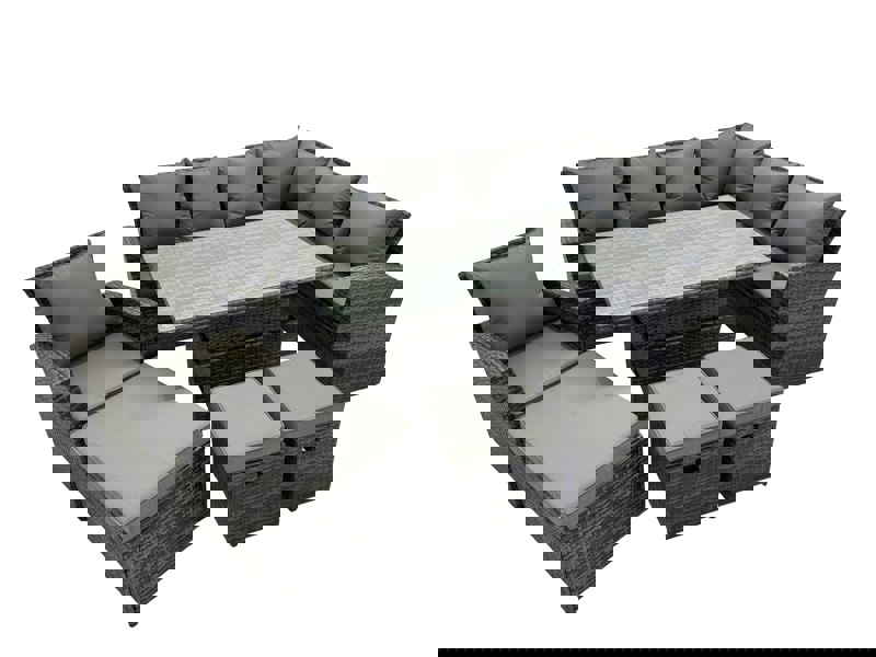 This classic high-back sofa set is designed to accommodate up to 10 people, creating a comfortable setting for relaxed outdoor lounging and casual entertaining. Finished in dark grey mixed PE rattan with matching dark grey fabric, it brings a coordinated look to patios, terraces and garden spaces.