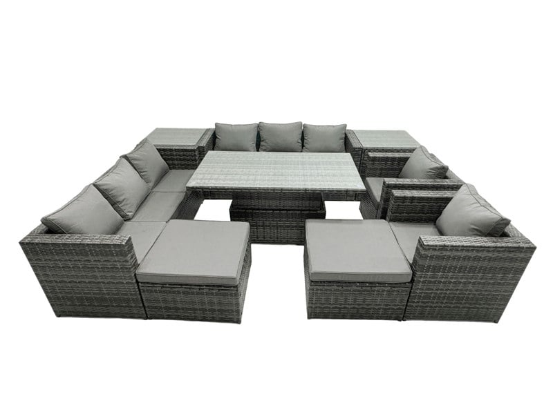 Designed for relaxed outdoor living, this rattan dining and lounge set brings a sleek, modern look to patios, balconies and gardens. With a rising table that can be used as a coffee table or dining table, it is easy to switch from daytime lounging to outdoor meals.