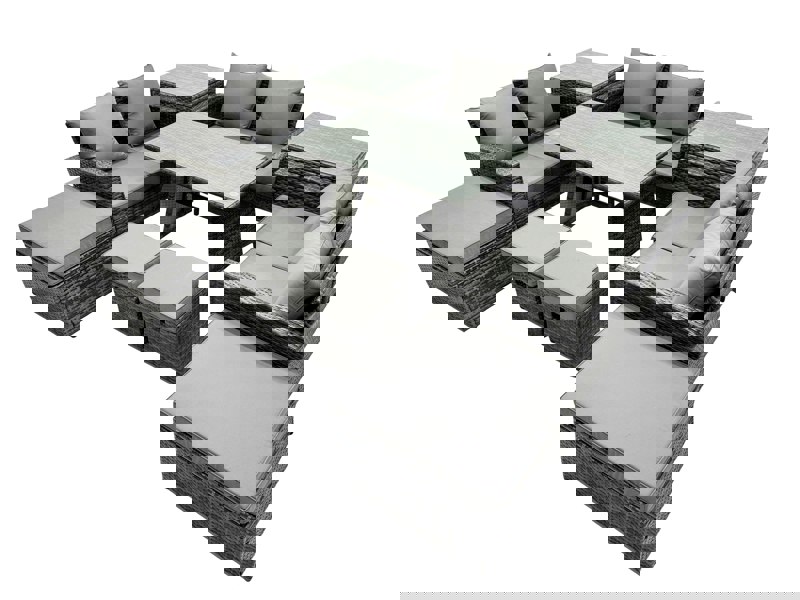 Designed for relaxed outdoor living, this cushioned PE rattan sofa set brings comfortable support to your garden or balcony. With a coordinating dining table, side tables and footstools, it creates a practical space for everyday lounging and outdoor dining.