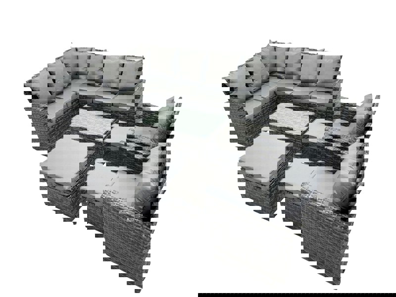 Made with high quality PE rattan and a durable galvanised steel construction, the set is built for sturdy, long-lasting use. A rectangular coffee table with tempered glass completes the layout, while the included footstools offer flexible extra seating or a place to put your feet up.
