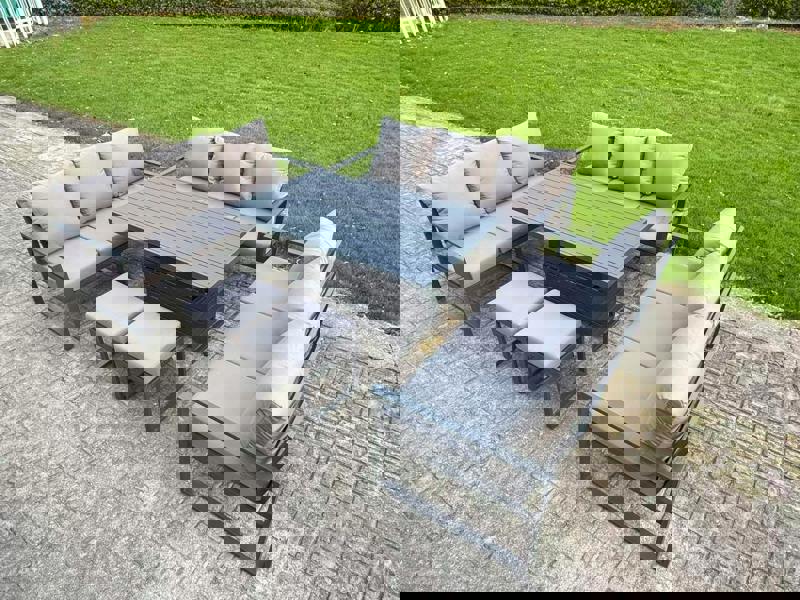 The Fimous U-shaped garden furniture set brings flexible outdoor lounging and dining to your patio or garden. Designed as a rising sofa dining set, it centres around an adjustable table that transitions smoothly between coffee-table height and dining height, making it easy to switch from relaxed drinks to outdoor meals.
