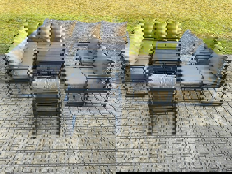 Built with a high quality aluminium frame construction for sturdiness and long lasting use, the set is finished in dark grey powder coating with dark grey fabric. Deep seat cushions and soft pillow back cushions add comfort for everyday lounging.
