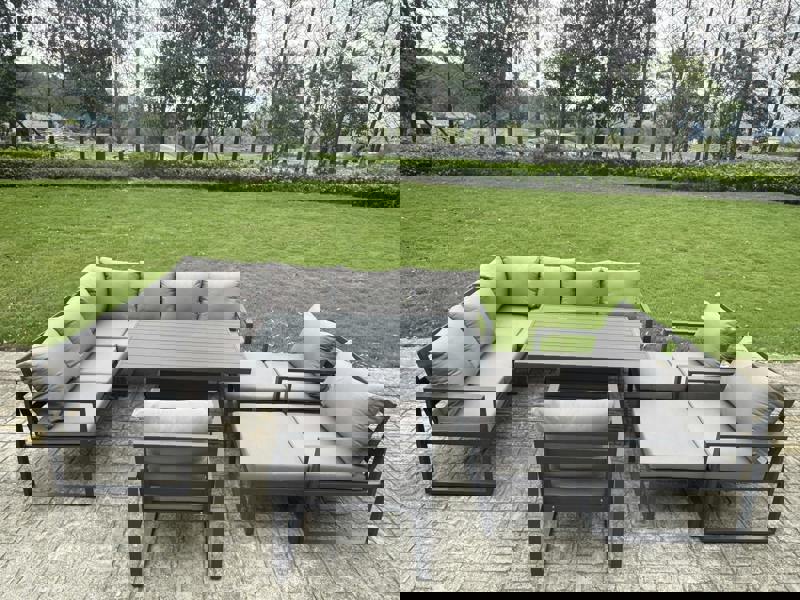 Create a versatile outdoor setting with this 11 seater aluminium garden furniture set, designed for relaxed lounging and easy dining on the patio or in the garden. Finished in dark grey, the set includes an adjustable rising dining table that transitions smoothly between coffee and dining heights, making it ideal for everything from morning drinks to evening entertaining.