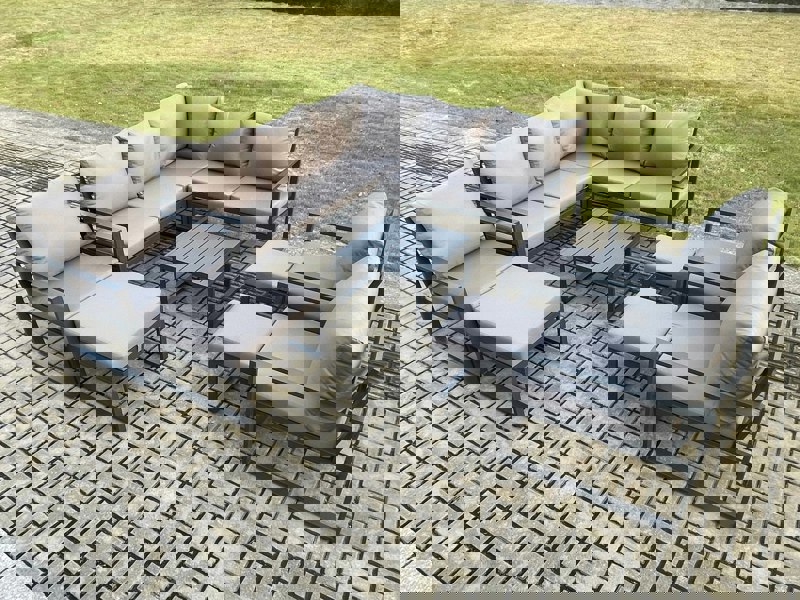 Built with a high quality aluminium frame for sturdiness and long-lasting use, the set is finished in dark grey powder coating with dark grey fabric. Handmade construction, an aluminium table top without glass, and generously cushioned seating help create a relaxed, inviting place to unwind.