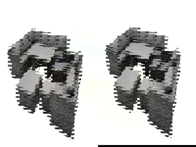 Finished in dark grey mixed PE rattan, the set includes a dining table with a tempered glass top and comfortable seating with thick seat cushions and soft pillow back cushions. Supplied flat packed, it is easy to assemble and simple to reposition when you want to refresh your layout.