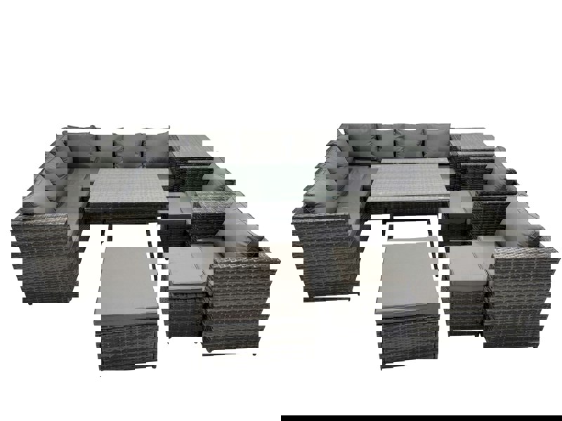 Finished in dark grey mixed PE rattan, the set includes seat cushions with soft pillow back cushions for added comfort, plus tempered glass table tops secured with suckers to help prevent sliding. Supplied flat packed for easy assembly.