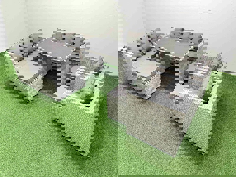 Create a refined outdoor dining and lounging space with the Fimous 11 Seater Wicker PE Rattan Furniture Set in light grey mixed rattan with dark grey fabric. Designed for flexible garden living, the modular layout makes it easy to arrange seating for relaxed afternoons or outdoor meals.
