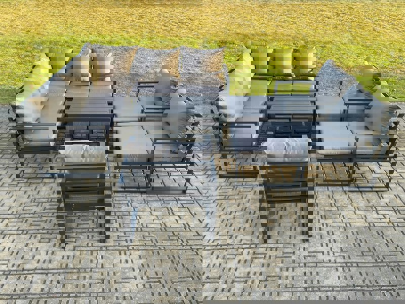 Finished in dark grey powder coating with dark grey fabric, the set is made with an alloy aluminium frame and includes a handmade aluminium table top without glass. Seat cushions are 9 cm thick, paired with soft pillow back cushions for added comfort.