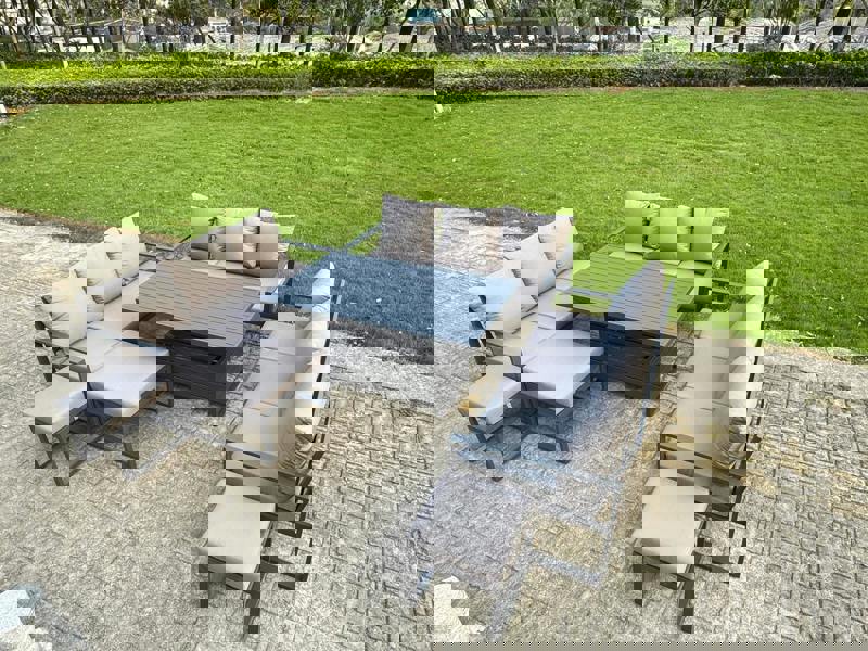 This deluxe aluminium adjustable rising sofa dining set is designed to bring flexible comfort to your patio or garden. With an adjustable table that transitions from a low coffee-table height to a dining height, it supports relaxed lounging and easy outdoor dining in one coordinated set.
