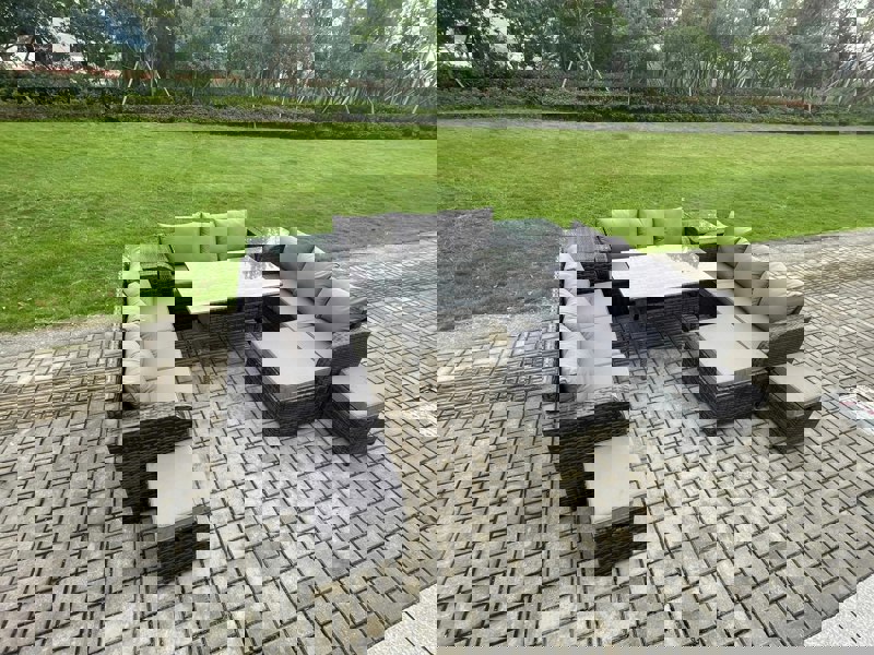 With an ergonomic high back and reclining design, plus an 8cm thick seat cushion (no back cushions, as pictured), it offers a comfortable place to gather with family and friends. The dining table features 5mm clear tempered glass with suckers on the surface to help prevent sliding.
