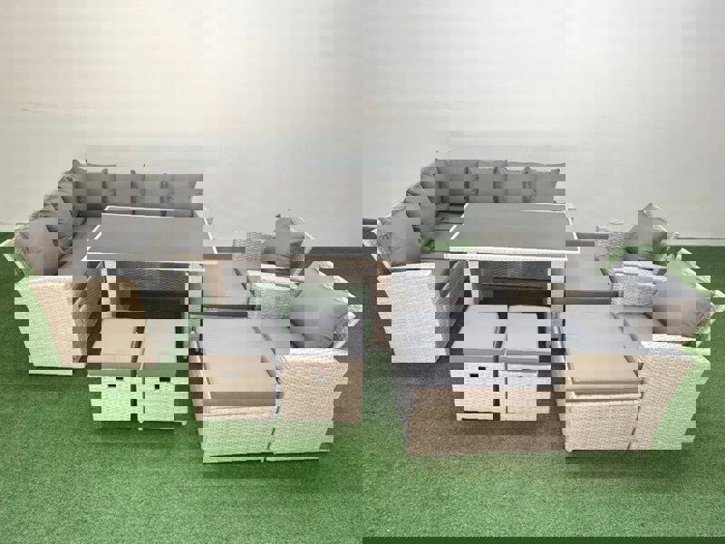 This classic corner sofa set is designed for outdoor lounging and dining, with seating for up to 10 people. Finished in premium dark grey rattan and paired with comfortable seat and soft back cushions, it offers a refined setting for relaxed gatherings in the garden.