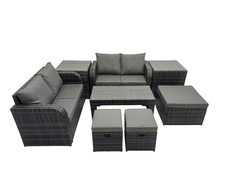 Crafted from high quality PE rattan and supported by durable galvanised steel tube frames with a powder coating to help prevent rust, the set is made for sturdy, long-lasting use. An ergonomic high back and reclining design enhance comfort, while thick seat and back cushions complete the relaxed feel.