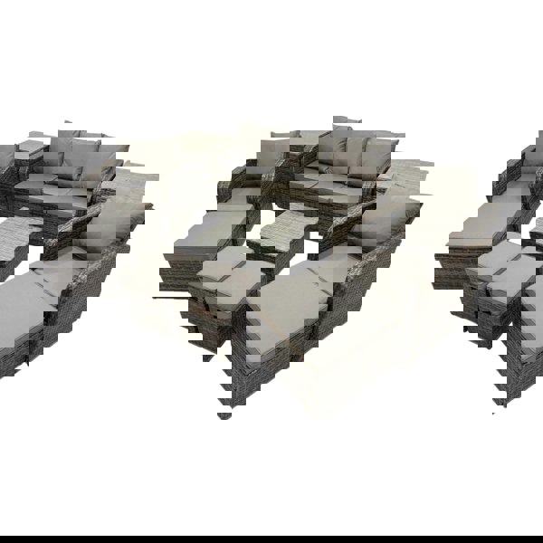 Bring a refined, coordinated look to your patio, balcony or indoor living space with this rattan sofa set in dark grey mixed rattan with matching dark grey fabric. Designed for relaxed everyday lounging, it combines a spacious 3 seater sofa with reclining chairs, footstools and tables to create a versatile setting for drinks, conversation and downtime.