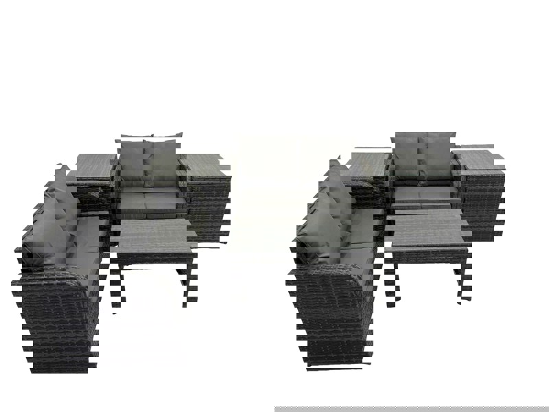 Designed for both indoor and outdoor use, this rattan patio set brings a refined balance of country chic and modern minimalism to your patio, balcony or living space. Finished in dark grey mixed rattan with dark grey fabric, it offers a coordinated look that sits comfortably in contemporary settings.