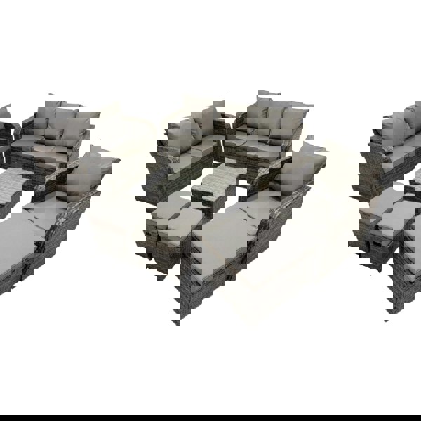 This rattan patio sofa set is designed for both indoor and outdoor use, making it a versatile choice for a conservatory, patio or balcony. Finished in dark grey mixed rattan with matching dark grey fabric, it brings a clean, modern look with a subtle country-chic influence.
