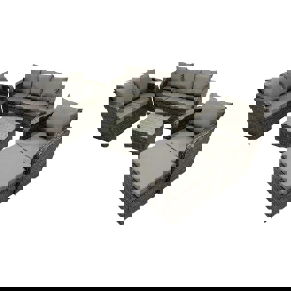 This rattan patio sofa set is designed for both indoor and outdoor use, making it a versatile choice for a garden, patio or balcony. With high quality PE rattan and a durable galvanised steel construction, it offers a sturdy, long-lasting setup with an elegant look that blends country chic with modern minimalism.