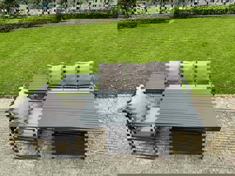 Refresh your patio, garden or balcony with this 4 piece aluminium lounge seating and dining set, designed for relaxed coffee moments and easy outdoor dining. Finished in dark grey, the set includes a height-adjustable table that transitions smoothly between coffee and dining settings, making it simple to adapt your space for everyday use or entertaining.