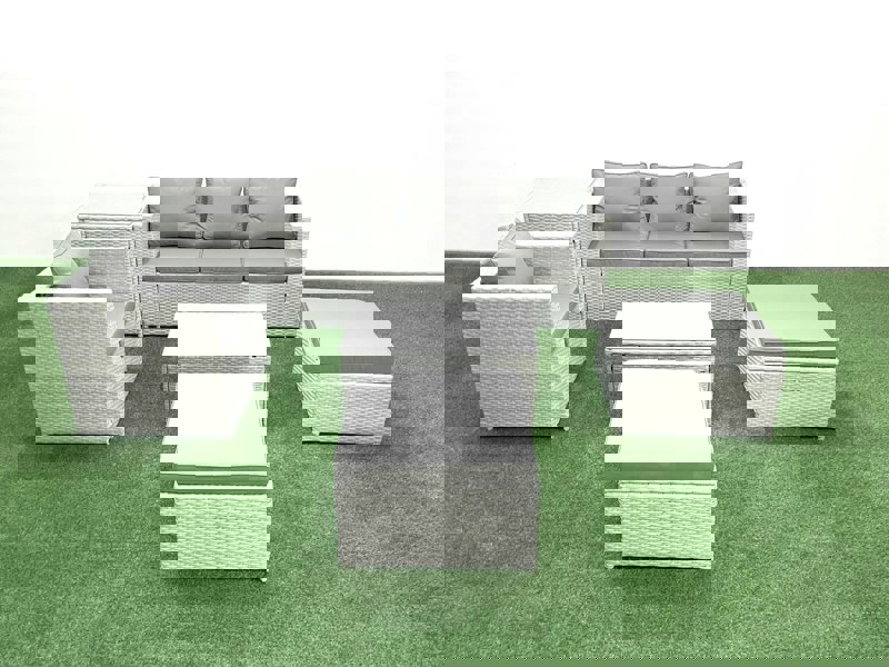 Made with light grey mixed rattan and finished with dark grey fabric, the set is built for lasting everyday use. A tempered glass tabletop is included, with a sucker on the surface to help prevent sliding for added stability.