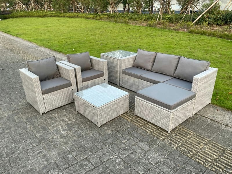 Create a refined outdoor lounge area with the Fimous 6 Seat Light Grey Lounge Outdoor PE Rattan Garden Furniture Set. Designed for patio or garden use, this coordinated set combines PE rattan with galvanised steel construction for a sturdy, long-lasting finish that can be kept outdoors all year round.