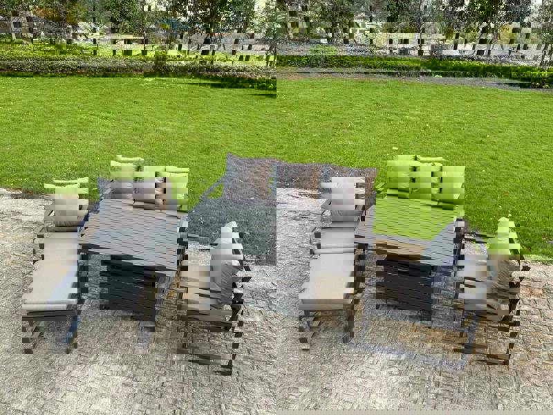 Designed for relaxed outdoor living, this deluxe aluminium adjustable rising sofa dining set brings flexible seating and dining to your patio or garden. The adjustable table transitions smoothly between a low coffee table height and a dining height, making it easy to switch from casual drinks to outdoor meals.
