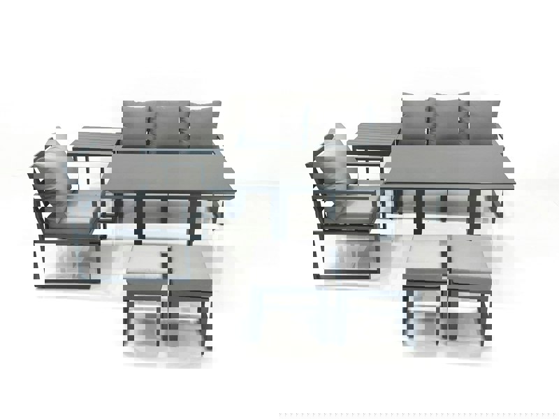 Designed for relaxed outdoor dining and everyday lounging, this adjustable rising sofa dining set brings flexibility to your patio or garden. The aluminium frame is finished with a powder coating for sturdiness and structural durability, while the dark grey fabric and cushioned seating create a comfortable place to gather.