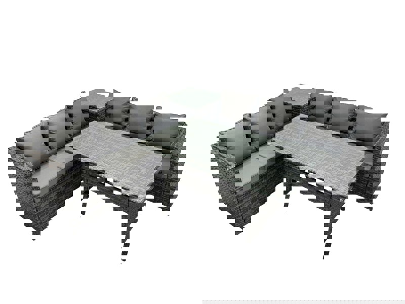 Finished in dark grey mixed rattan with dark grey fabric, the set includes a side coffee table and a rectangular dining table with a tempered glass top. Supplied flat pack, it requires self-assembly and is made for practical, low-maintenance outdoor living.