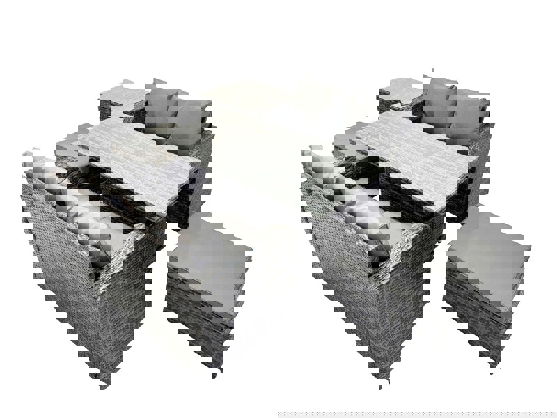 Designed for flexible outdoor living, this modern deluxe rattan garden furniture set suits a range of occasions, from relaxed coffee moments to dining. The rising table adjusts between two heights, allowing you to switch the setup to match your plans, while included cushions are shaped to fit the sofas and chairs for added comfort.
