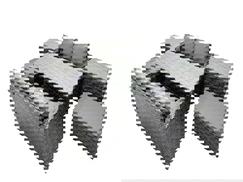 Finished in dark grey mixed rattan with dark grey fabric, the set includes fitted cushions shaped to the sofas and chairs for added comfort. Crafted with a sturdy galvanised steel tube metal frame and powder coating to help prevent rust, it is made for regular outdoor use while remaining easy to assemble from flat pack.