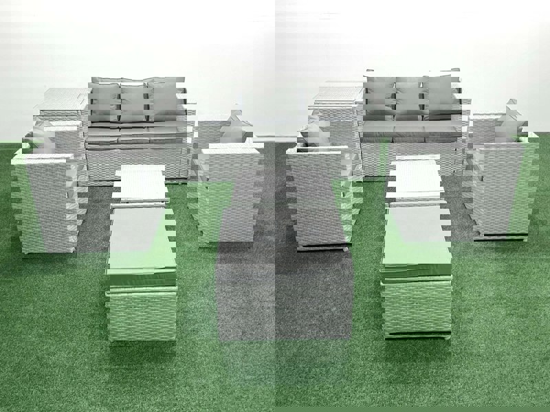 Create a refined outdoor seating area with this 6 seater rattan garden furniture set, designed for patios and gardens. Made from PE rattan with a galvanised steel structure, it is built for strength and year-round outdoor use. Light grey mixed rattan is paired with dark grey fabric for a coordinated finish, while the set’s handmade construction adds an artisan touch to your space.
