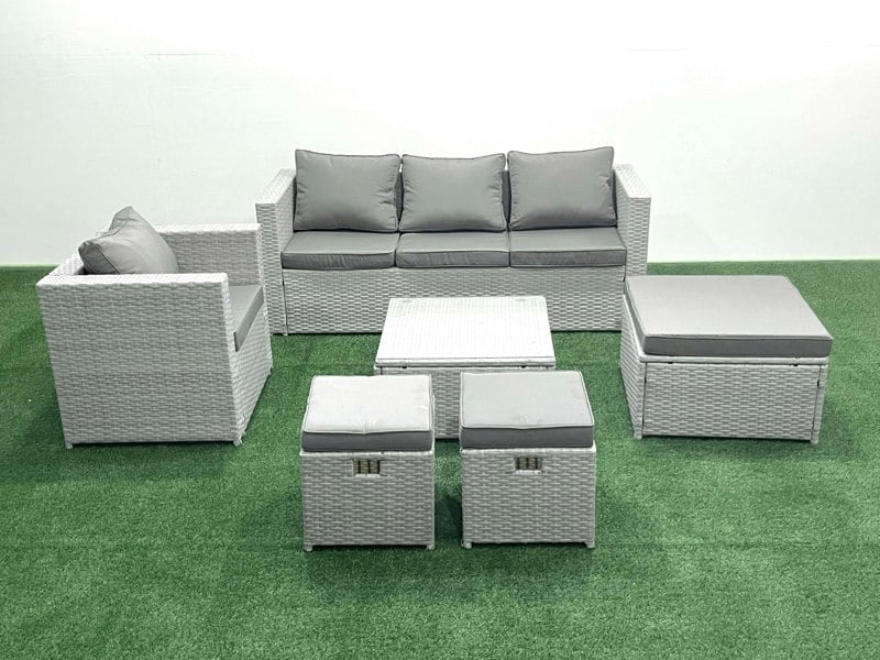 Create a refined outdoor seating area with this 6 seater rattan garden furniture set, designed for patios and gardens. Made with light grey mixed PE rattan and supported by a robust galvanised steel structure, it is built for outdoor use throughout the year. Dark grey fabric cushions complete the look, while generous padding helps you settle in comfortably for everyday lounging.