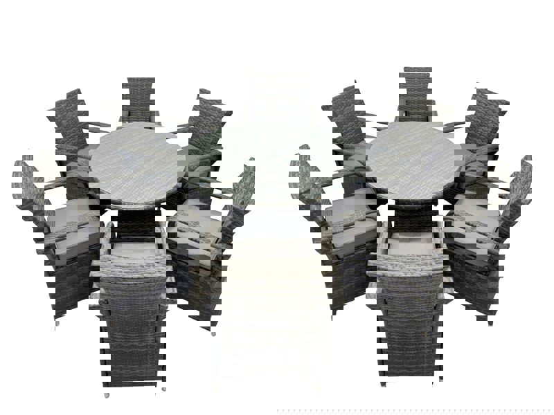 Designed for patio or garden dining, this deluxe rattan dining set brings a coordinated look to outdoor spaces, with a comfortable high-back chair design and matching table options. Finished in a premium dark grey mix rattan with dark grey fabric cushions, it is created to suit everyday outdoor use while keeping your seating feeling considered and inviting.