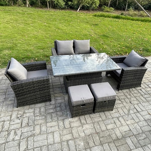 The rising dining table adjusts between two heights, making it easy to switch from a low table to a dining-height surface. The set is finished with a tempered glass tabletop secured with suckers to help prevent sliding, while removable cushion covers support low-maintenance everyday use.
