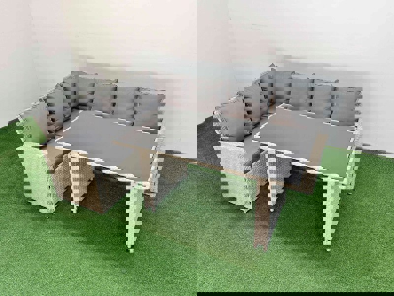 Designed for outdoor dining and relaxed entertaining, this classic corner sofa set seats up to 9 people and pairs a comfortable, soft back cushion with a coordinating oblong dining table. Finished in mixed rattan with dark grey fabric, it brings a clean, contemporary look to patios and garden spaces.