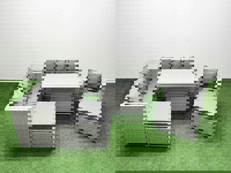 The Fimous 7 PCs Rising Dining Table Set is a deluxe rattan sofa dining set designed for relaxed patio or garden living. With a rising table that can be used for both coffee and dining, it offers a flexible layout for everyday lounging and outdoor meals.