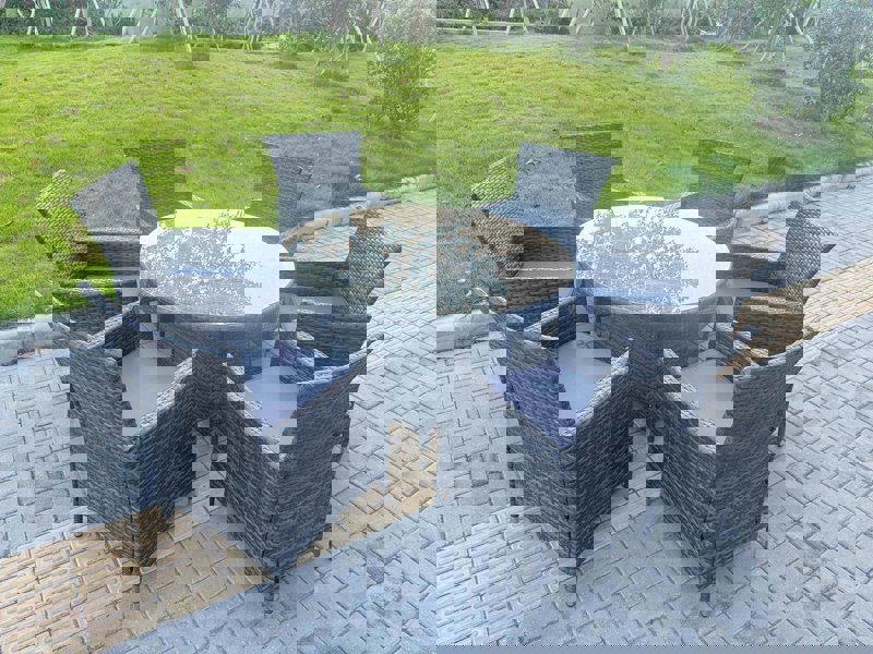 Create an inviting outdoor dining space with this premium PE rattan set, designed for relaxed meals and easy entertaining in the garden or on the patio. Built with a galvanised steel frame and finished in dark grey rattan with matching weather-resistant fabric, it offers a coordinated look suited to outdoor living.