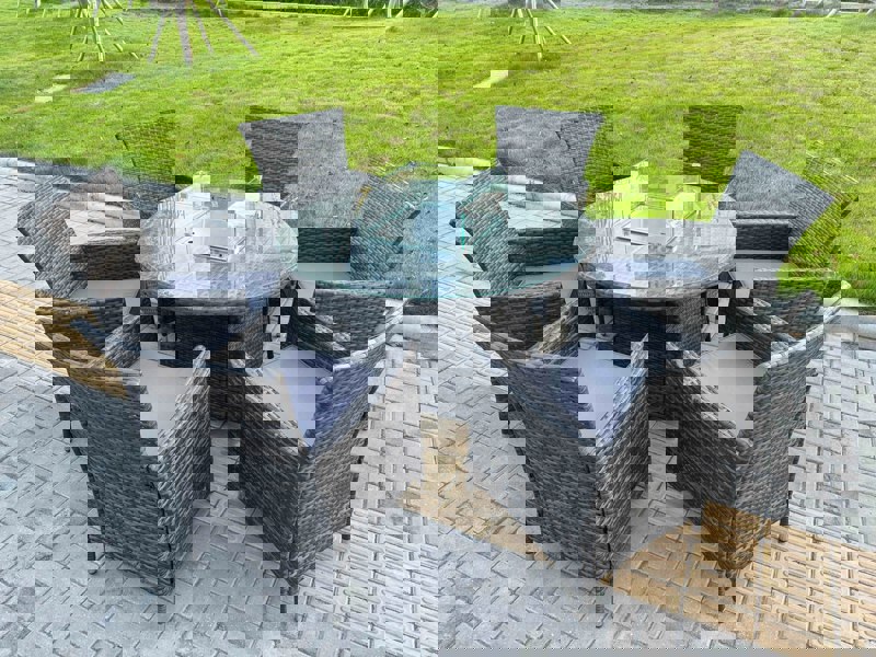 Bring relaxed outdoor dining to your patio with the Fimous 7-piece garden furniture set, featuring a round gas fire pit table and 6 dining chairs in a dark grey finish. Designed for sociable evenings, the integrated fire pit creates a welcoming focal point while the tempered glass tabletop offers heat resistance and everyday practicality.