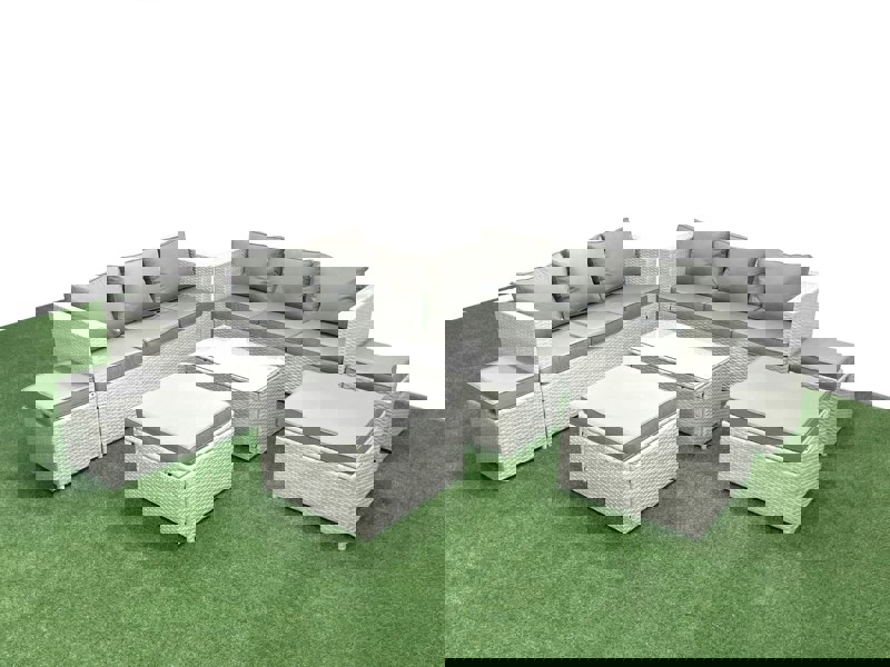Create a refined outdoor seating area with this 7-piece rattan garden furniture set, designed for use across the garden, patio or conservatory. Finished in light grey mixed rattan with dark grey fabric, it brings a modern look while providing a comfortable place to relax and entertain.