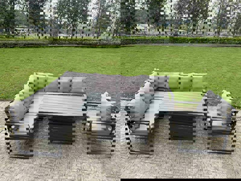 Designed for relaxed outdoor living, this deluxe aluminium adjustable rising sofa dining set brings flexible seating and dining to your patio or garden. The adjustable table transitions smoothly between coffee-table height and dining height, making it easy to switch from casual lounging to outdoor meals.