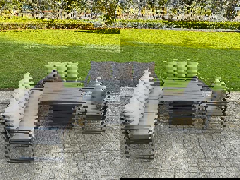 Built on a high-performance alloy aluminium frame with a dark grey powder-coated finish, this set is made for structural durability and rust resistance. Thick seat cushions and soft pillow back cushions add comfort, while removable cushion covers help keep day-to-day care simple.