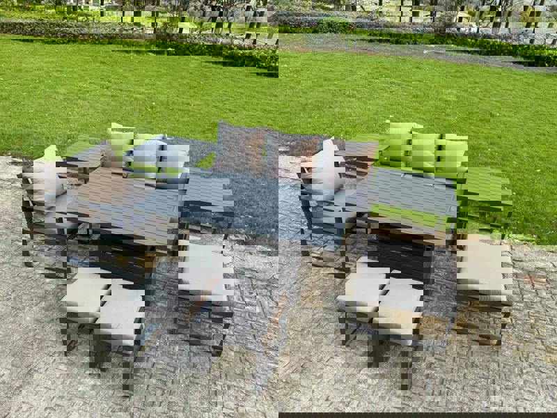 Crafted from rust-proof alloy aluminium with a dark grey powder-coated finish, this set is built for durability outdoors. Thick 9cm seat cushions and soft pillow back cushions add comfort, while removable cushion covers help keep maintenance simple.