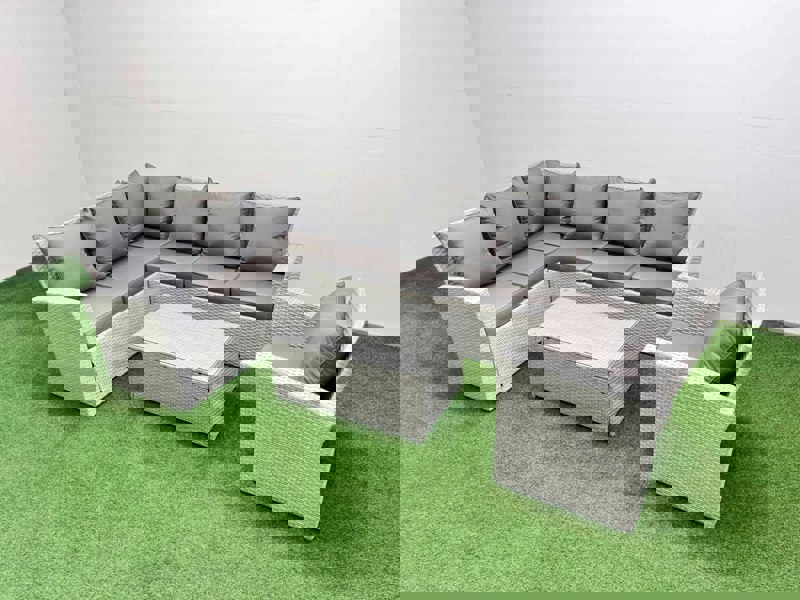 Finished in light grey mixed rattan with dark grey fabric, the set is supplied flat packed for straightforward assembly. Thoughtful details, including a high back and a reclining design, are paired with practical, low-maintenance cushions for everyday use.