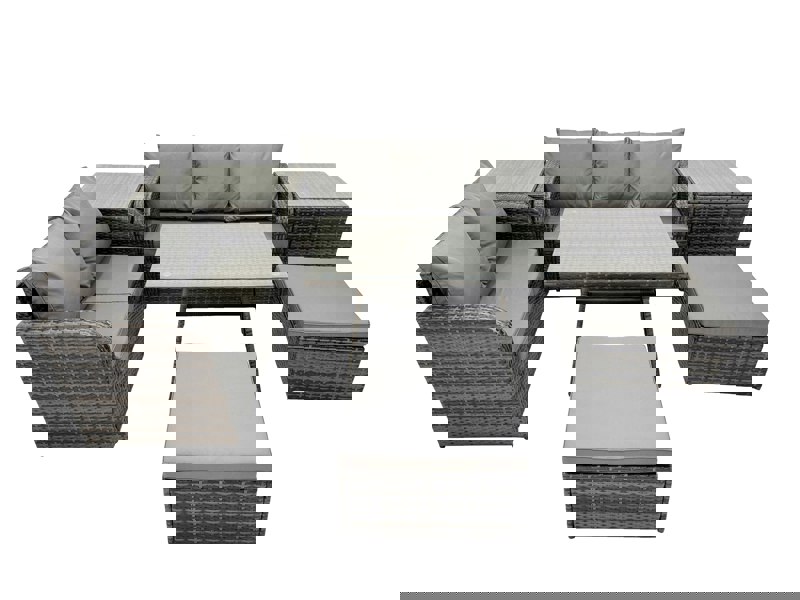 Made with PE rattan and a galvanised steel tube frame with powder coating to help prevent rust, the set is built for everyday use. Thoughtful details include an ergonomic high back with a reclining design, plus a tempered glass dining table top secured with suckers to help prevent sliding.