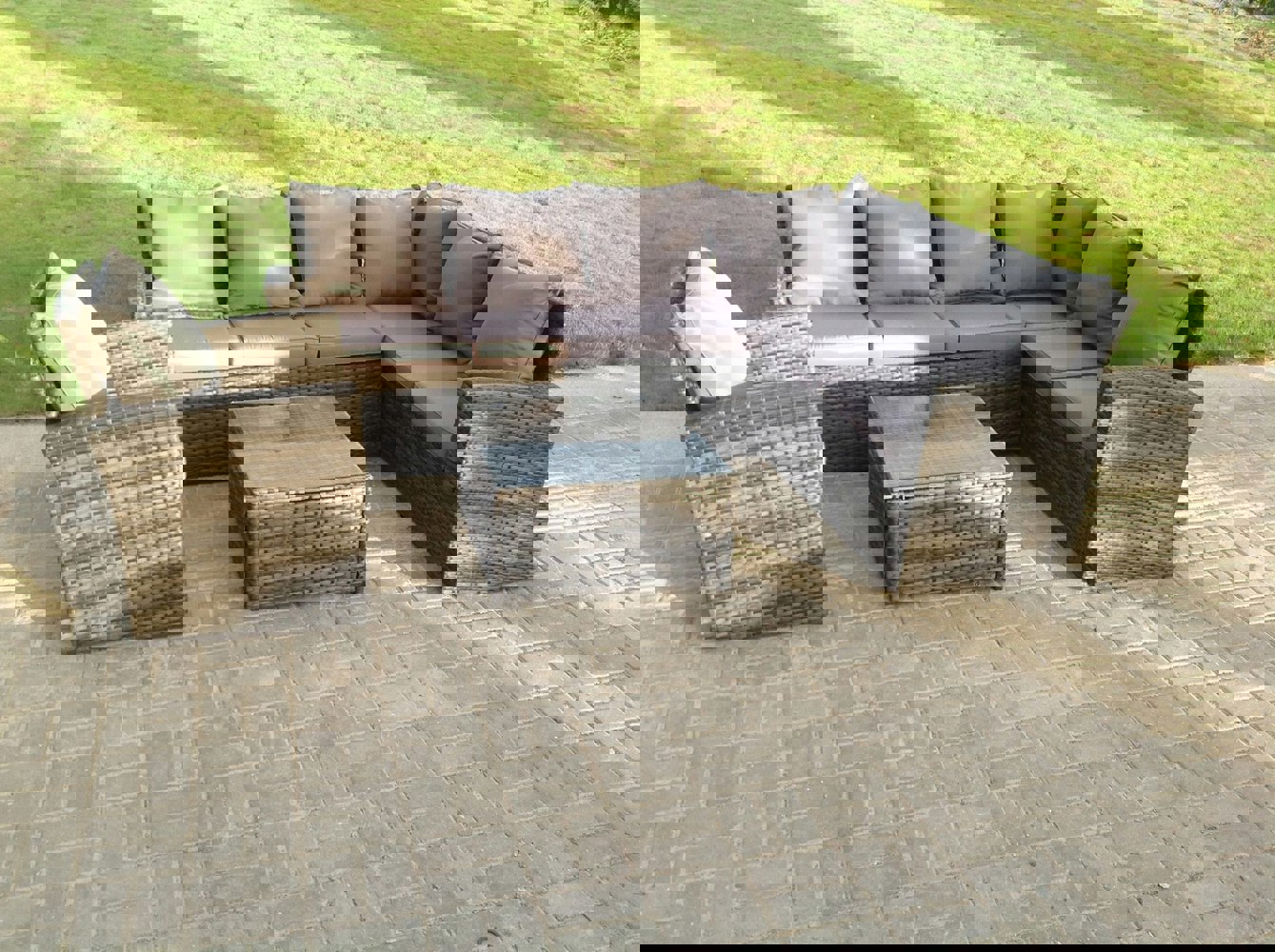 This classic L-shaped corner sofa set is designed for outdoor lounging and socialising, with seating for up to 7 people. Finished in premium dark grey mixed PE rattan, it is made to withstand British weather and comes with soft back cushions and an 8cm thick seat cushion for added comfort.