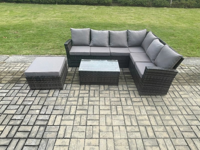 Finished in dark grey mixed rattan with dark grey fabric, the set includes an oblong coffee table topped with 5mm thickness transparent tempered glass, secured with suckers to help prevent sliding. For everyday practicality, it arrives flat packed for easy assembly, with low-maintenance features including removable cushion covers and pieces that are easy to move and rearrange.