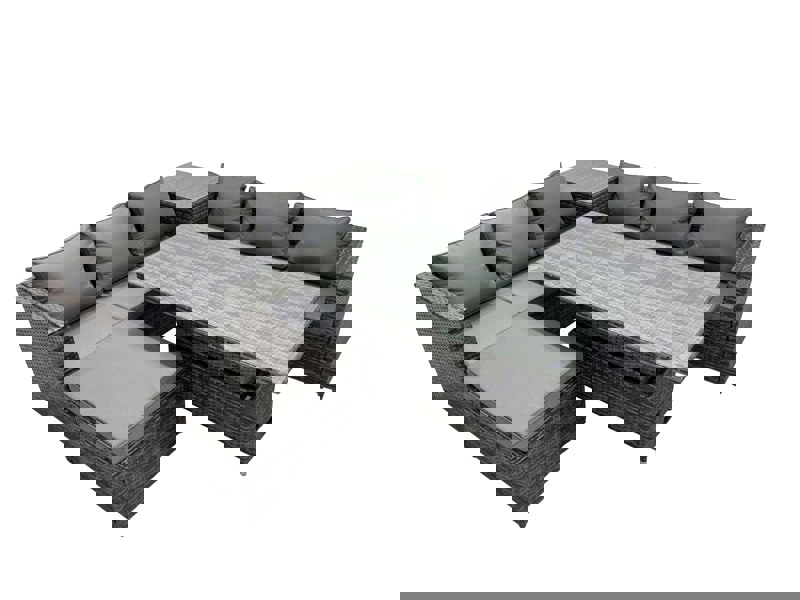 Finished in dark grey mixed rattan with dark grey fabric, the set includes a rising dining table that can be used as a coffee or dining table. A tempered glass tabletop and a sturdy metal frame complete the practical, everyday design.