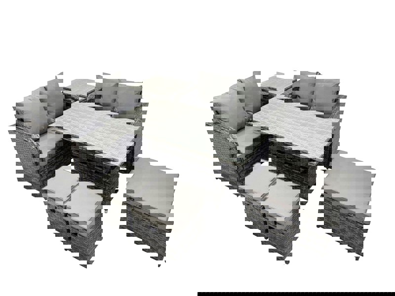 The rising dining table adjusts between two heights, allowing you to switch the setup from coffee to dining as needed. Finished in dark grey mixed rattan with matching dark grey fabric, this set brings a coordinated look to your space.